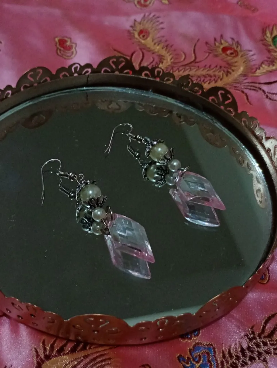 Brincos artesanais elegantes com detalhes em pérolas e pingentes em formato de losango rosa, perfeitos para adicionar um toque de sofisticação ao seu visual.