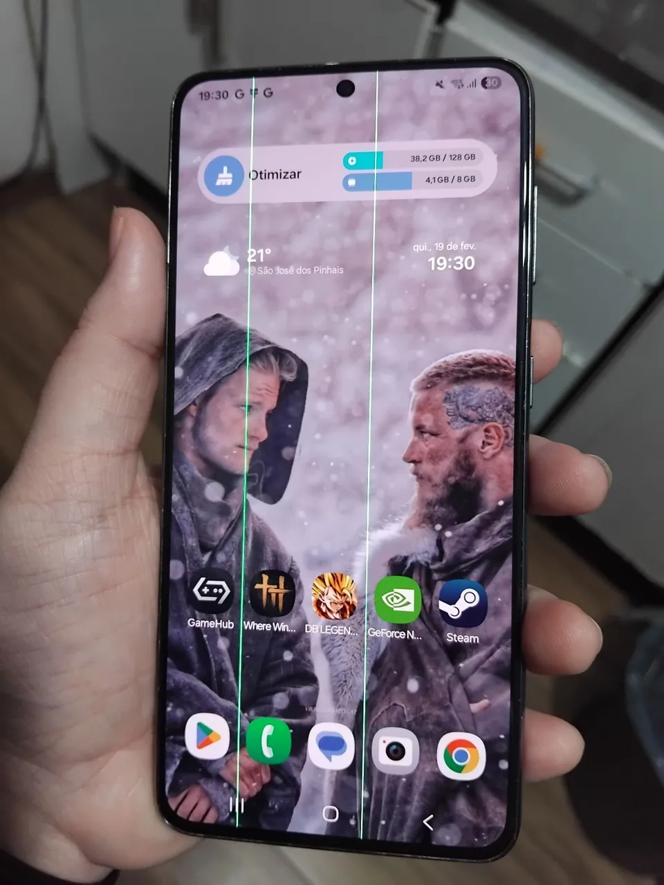 Vendo s21 5g funcionando perfeitamente tem marcas de uso na parte de trás e 2 listras verde na tela podendo usar assim ou trocar fica a critério de quem comprar. Touch 100%, biometria 100% bateria 100% audios 100%