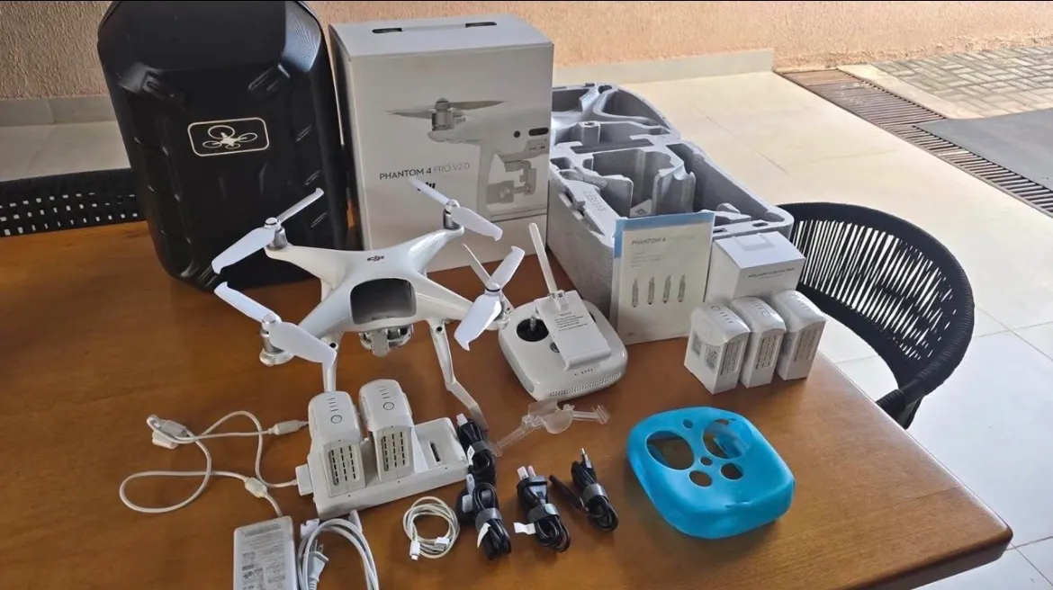 Drone DJI Phanton 4 PRO V2.0 Quantidade de baterias incluídas: 5 Versão: V2.0. Tipo de drone: aéreo. GPS incluído. Resolução máxima da câmera 4K. Inclui 5 baterias. Inclui controle remoto. Com acessórios incluídos: Amplificador de Sinal, Baterias adicionais, Cabos originais, Capa protetora do controle, Carregador, Controle remoto, Hub de Carregamento, Hélices Extras, Manual, Mochila de transporte, Protetor da câmera, prolongador de aterrissagem,