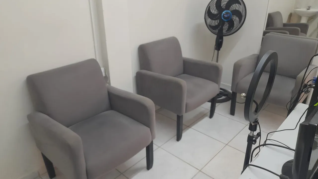 Mesa com 4 cadeiras, mesa de vidro para computador, TV 40 polegadas com controle LG, 3 poltronas, porta com visor, armário de ferro e 21 carteiras universitárias...