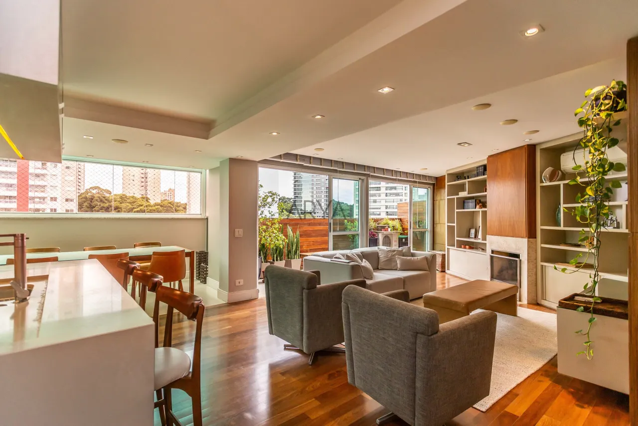 Belíssima cobertura duplex no Ecoville, assinada por Maurício Pinheiro Lima, com acabamentos de primeira qualidade que se revela em cada detalhe, como o elegante piso em madeira cumaru, bancada em Silestone e marcenaria sob medida em madeira freijó, em um projeto que alia sofisticação, conforto e funcionalidade, cercado por muito verde no entorno. Com 142m² privativos, o imóvel é distribuído em dois pisos: no primeiro pavimento estão os 3 dormitórios, sendo 1 suíte, todos climatizados, além de banheiro social, sala íntima, home office, depósito e lavanderia; no piso superior, o destaque fica para o amplo living climatizado e com lareira, cozinha integrada com churrasqueira a carvão, lavabo e um agradável terraço descoberto, ideal para momentos de lazer e contemplação. A cobertura conta ainda com 2 vagas de garagem e está inserida em um condomínio clube completo, que oferece piscinas coberta e descoberta, spa, academia, salão de festas, espaço gourmet, salão de jogos, brinquedoteca, playground, quadra esportiva e toda a tranquilidade de portaria 24 horas, proporcionando uma experiência completa de morar bem. Agende uma visita!