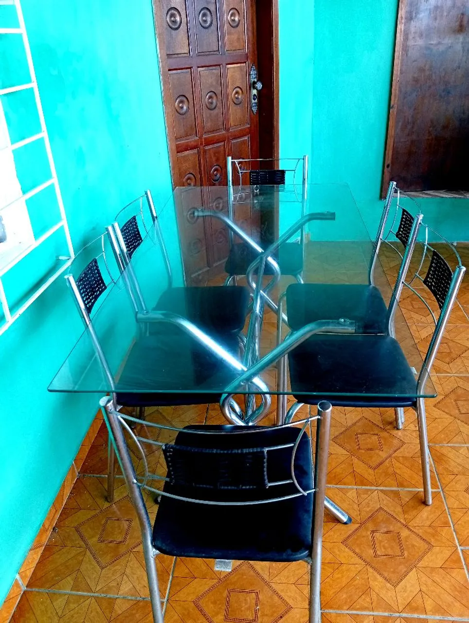 Conjunto de mesa com design moderno, perfeita para compor sua sala de jantar ou cozinha. Uma mesa com tampo de vidro e 6