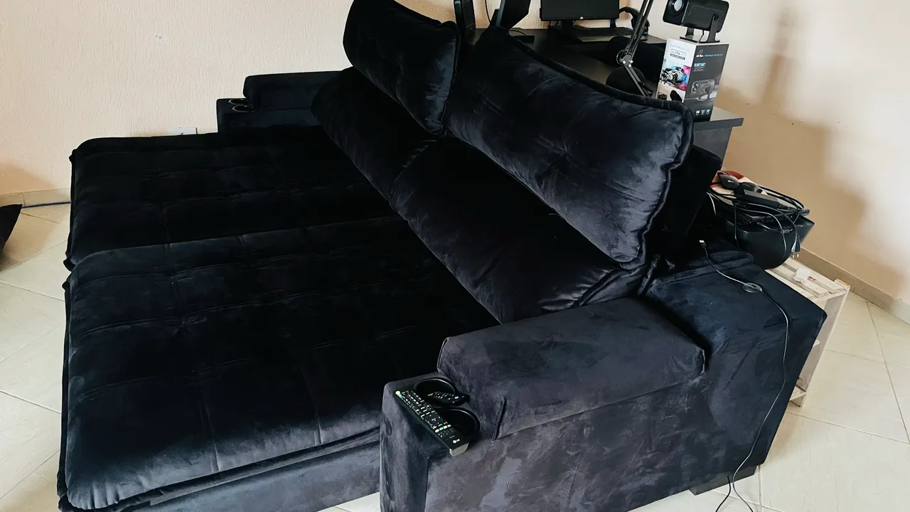 sofá retrátil em veludo preto com porta copo e carregamento USB. Nem um ano de uso! R$4.000,00 parcelo juros da máquina.