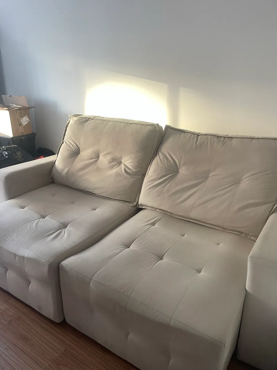 Sofá retrátil e reclinável de molas ensacadas em tecido suede na cor bege, em ótimo estado de conservação. Estou vendendo pois me mudei para um lugar menor. Valor negociável