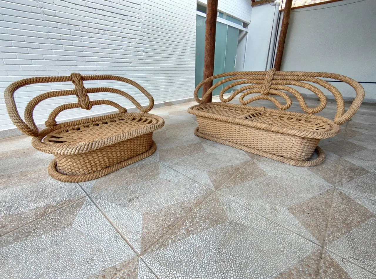 Conjunto de sofás que podem comportar 3 e 2 lugares, feitos em estrutura de ferro revestidos com corda marítima, peças realmente exclusivas, perfeitos para um toque rústico e elegante na sua casa! Design único e confortável. Em ótimo estado, as almofadas são novas ( espumas e tecido do encosto e assento são novos).