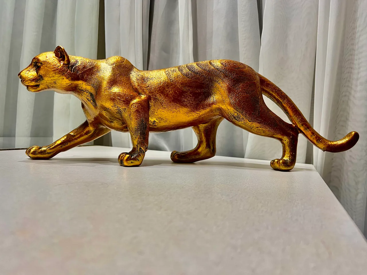 Produzida em resina de alta qualidade, com acabamento detalhado e pintura dourada brilhante, essa obra de decoração é perfeita para salas de estar, escritórios, recepções e ambientes modernos. Seu design realista e imponente cria um destaque especial, combinando arte e estilo em um único objeto.