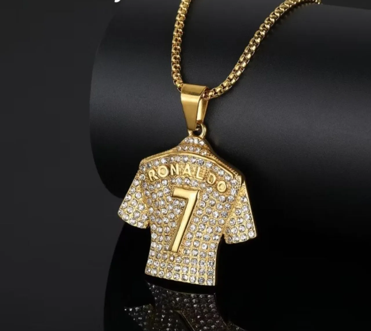 Colar com pingente de camisa de futebol do Ronaldo com número 7, cravejado com detalhes brilhantes. Um acessório perfeito para os fãs do craque.