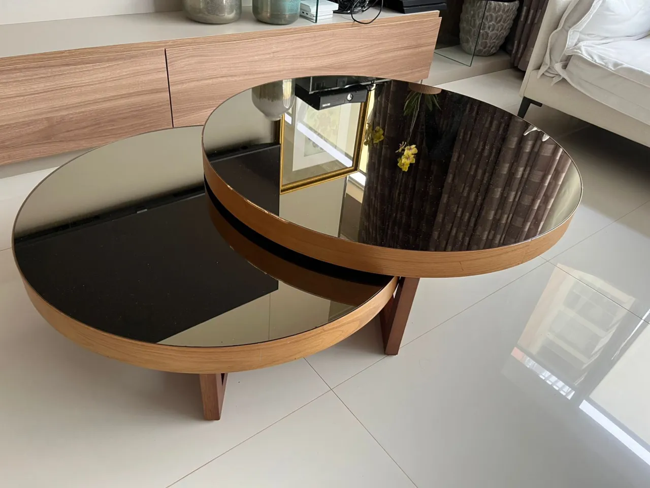 Linda mesa de centro com design moderno e elegante. Perfeita para complementar sua sala de estar, oferecendo um toque de sofisticação e funcionalidade. Diâmetro mesa maior: 91cm Altura mesa maior: 33cm Diâmetro mesa menor: 80,5cm Altura mesa menor: 26cm