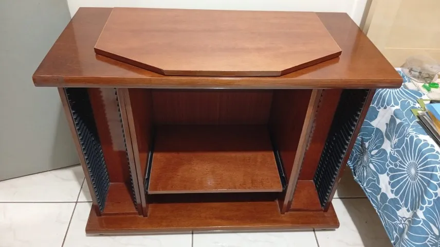 Rack de madeira para CDs e DVDs, em ótimo estado de conservação. Possui espaço para organizar sua coleção de discos e ainda conta com uma prateleira para outros objetos.