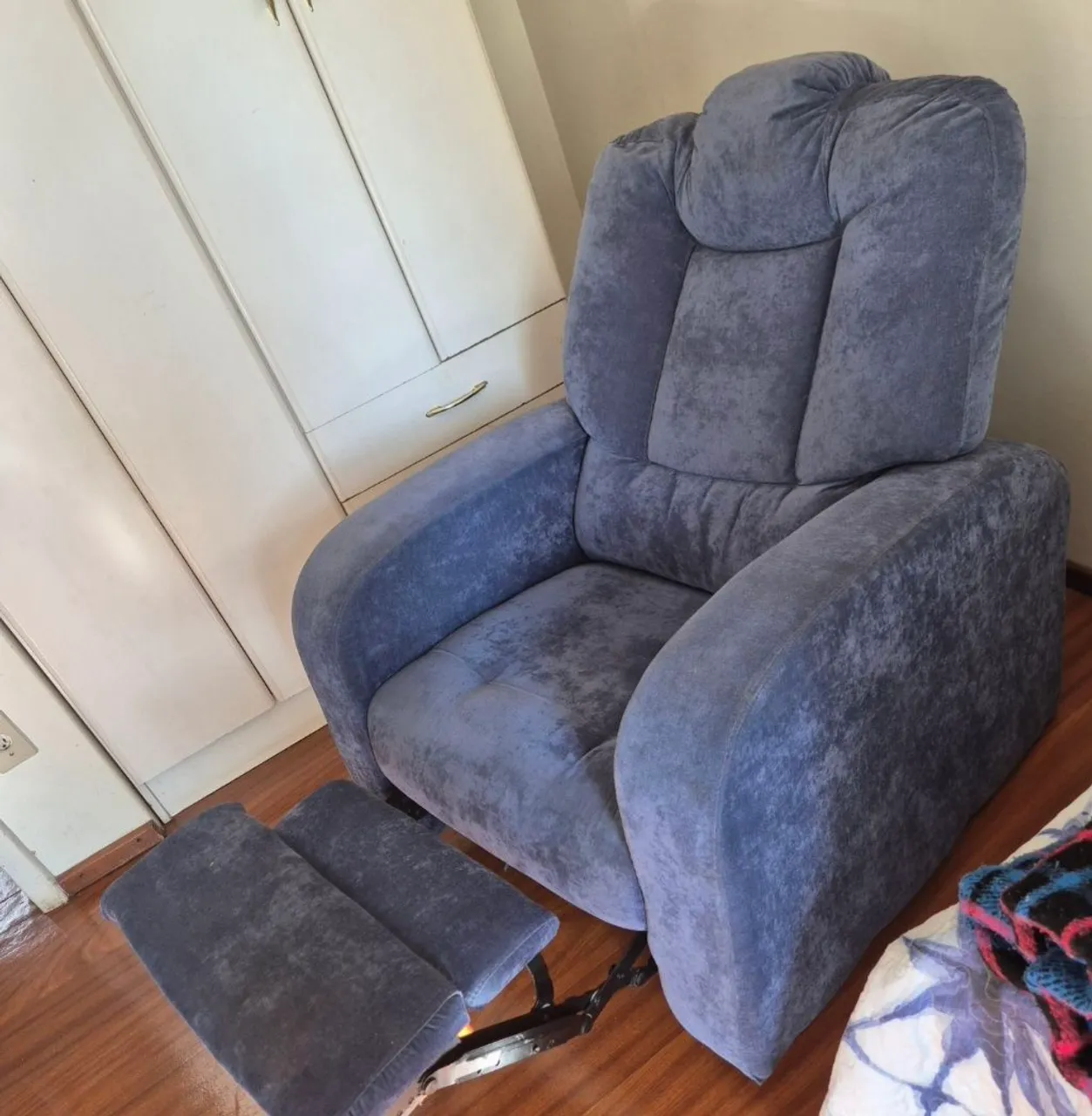 Poltrona reclinável super confortável, estofada em tecido macio na cor azul. Possui encosto alto com apoio para cabeça e braços largos, proporcionando muito conforto para descanso. Acompanha apoio para os pés retrátil.