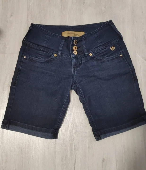 Bermuda jeans escuro, com detalhes em dourado. Perfeito para o dia a dia ou para um look mais casual.