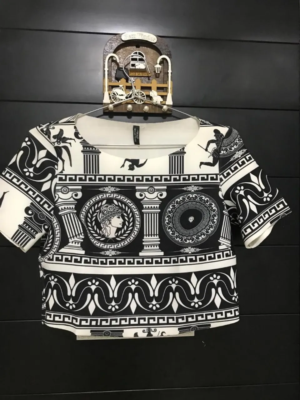 Blusa feminina com estampa inspirada na Grécia antiga. Perfeita para um look moderno e cheio de estilo.