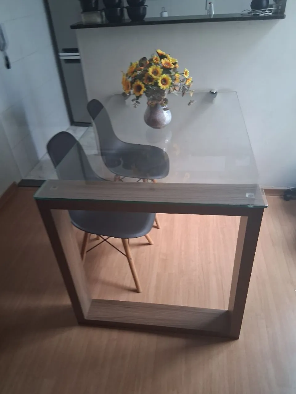 Linda mesa com tampo de vidro e estrutura em madeira, acompanhada de duas cadeiras modernas. Perfeita para sua sala de jantar ou cozinha!
