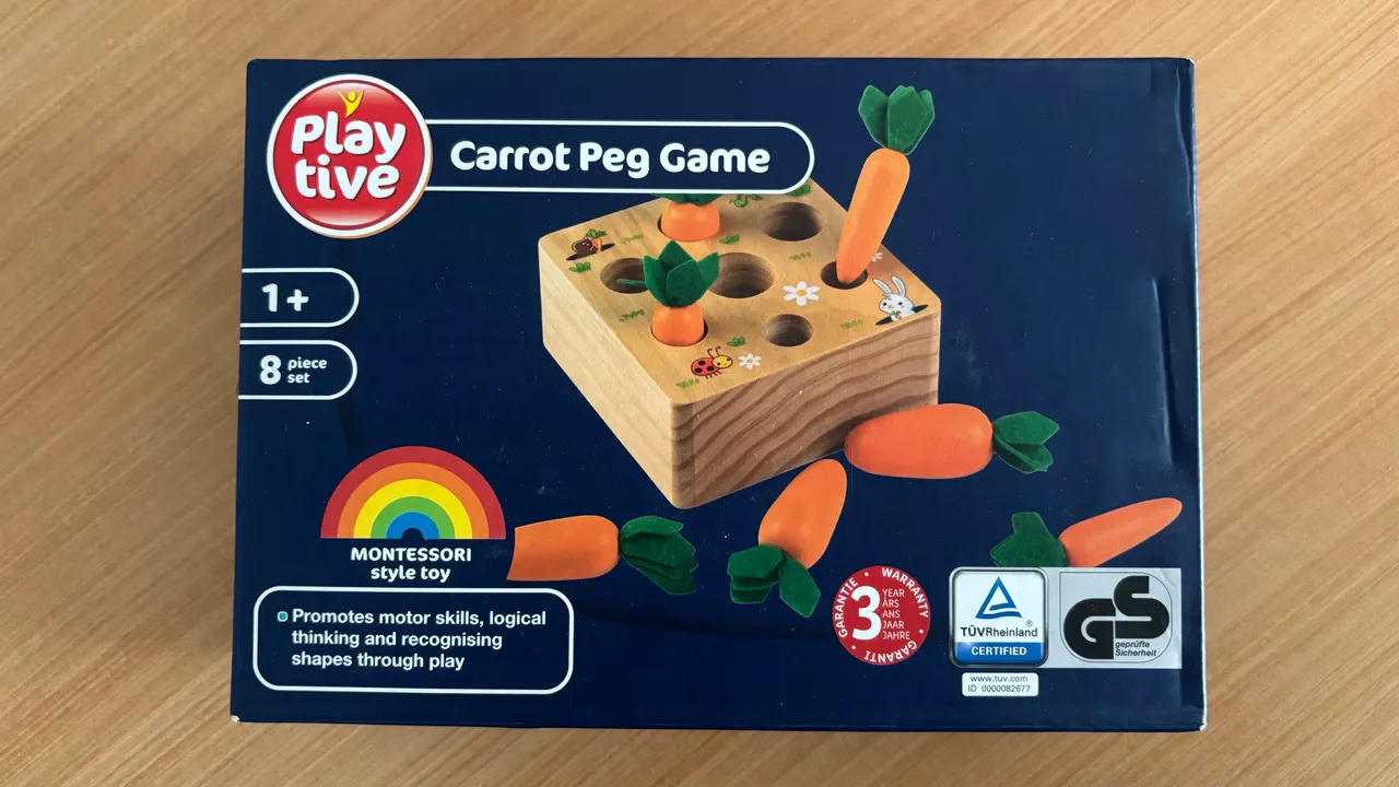 Conteúdo: Conjunto com 8 peças, incluindo blocos de madeira e cenouras de encaixe.