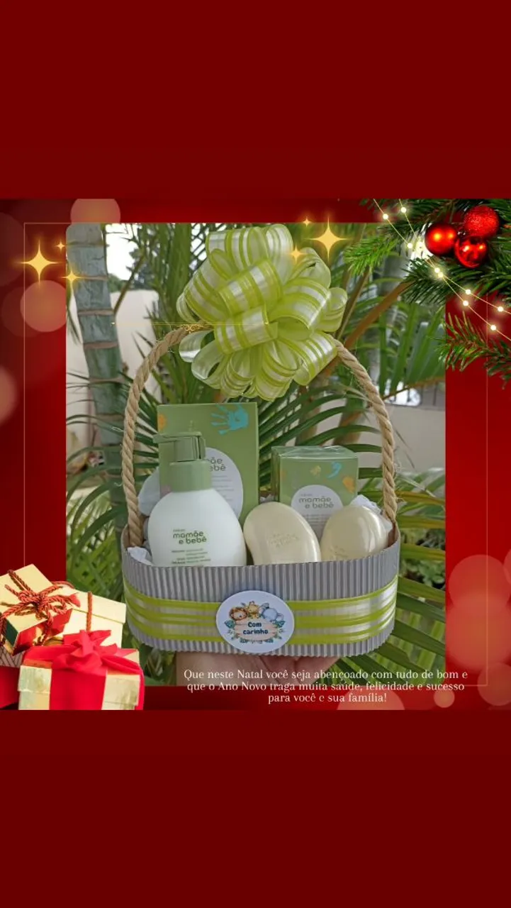 Cesta de presentes Mamãe e Bebê, perfeita para presentear com carinho. Contém produtos de cuidados para o bebê, com embalagens charmosas e aroma suave.