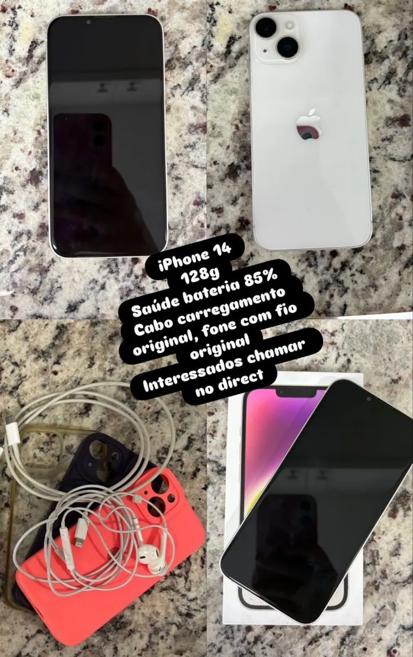 iPhone 14 de 128GB. Bateria com 85% de saúde, cabo e fone originais. Entre em contato para mais detalhes!