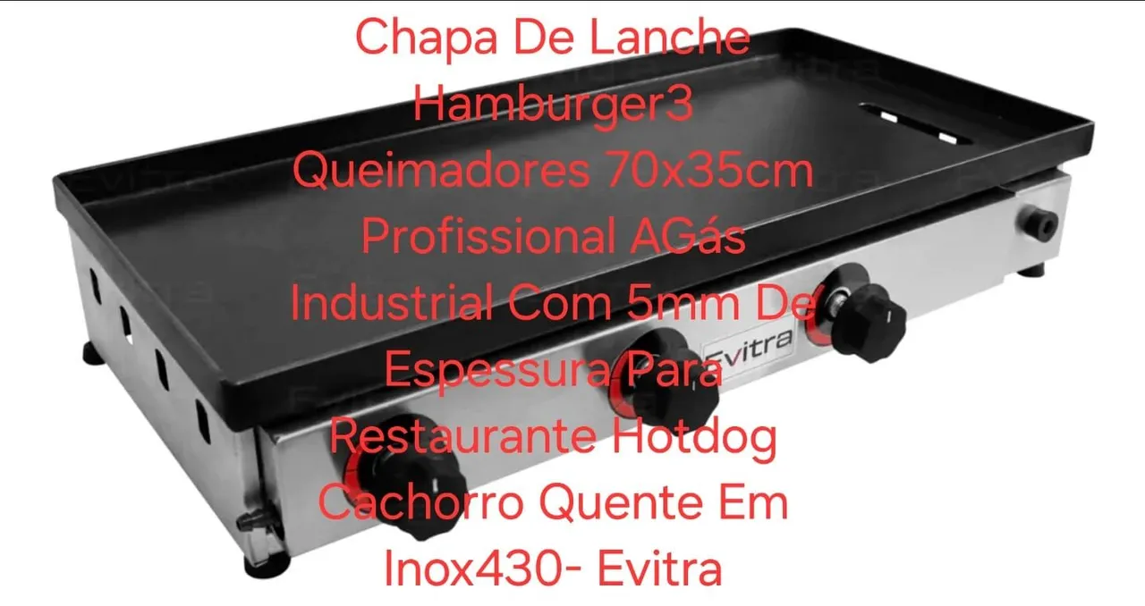 Prepare deliciosos lanches com a Chapa de Lanche Evitra! Ideal para restaurantes e lanchonetes, possui 3 queimadores, 70x35cm, profissional a gás e espessura de 5mm, perfeita para hambúrgueres e cachorros-quentes. Feita em Inox 430, garantindo durabilidade e eficiência.