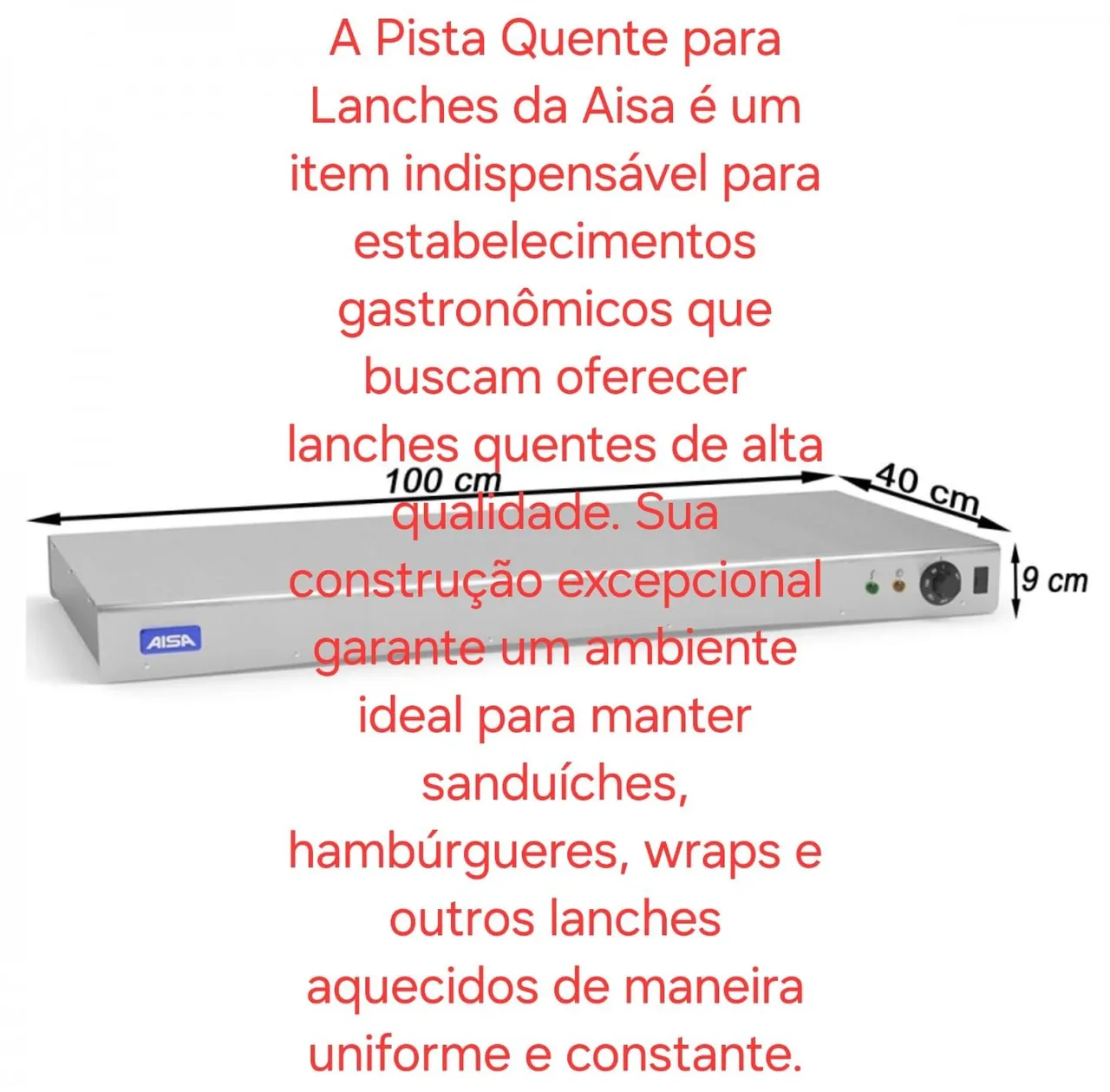 Mantenha seus lanches sempre quentes e apetitosos com a Pista Quente para Lanches da Aisa! Ideal para sanduíches, hambúrgueres e wraps, garantindo a temperatura perfeita para seus clientes. Construção excepcional para um aquecimento uniforme e constante.