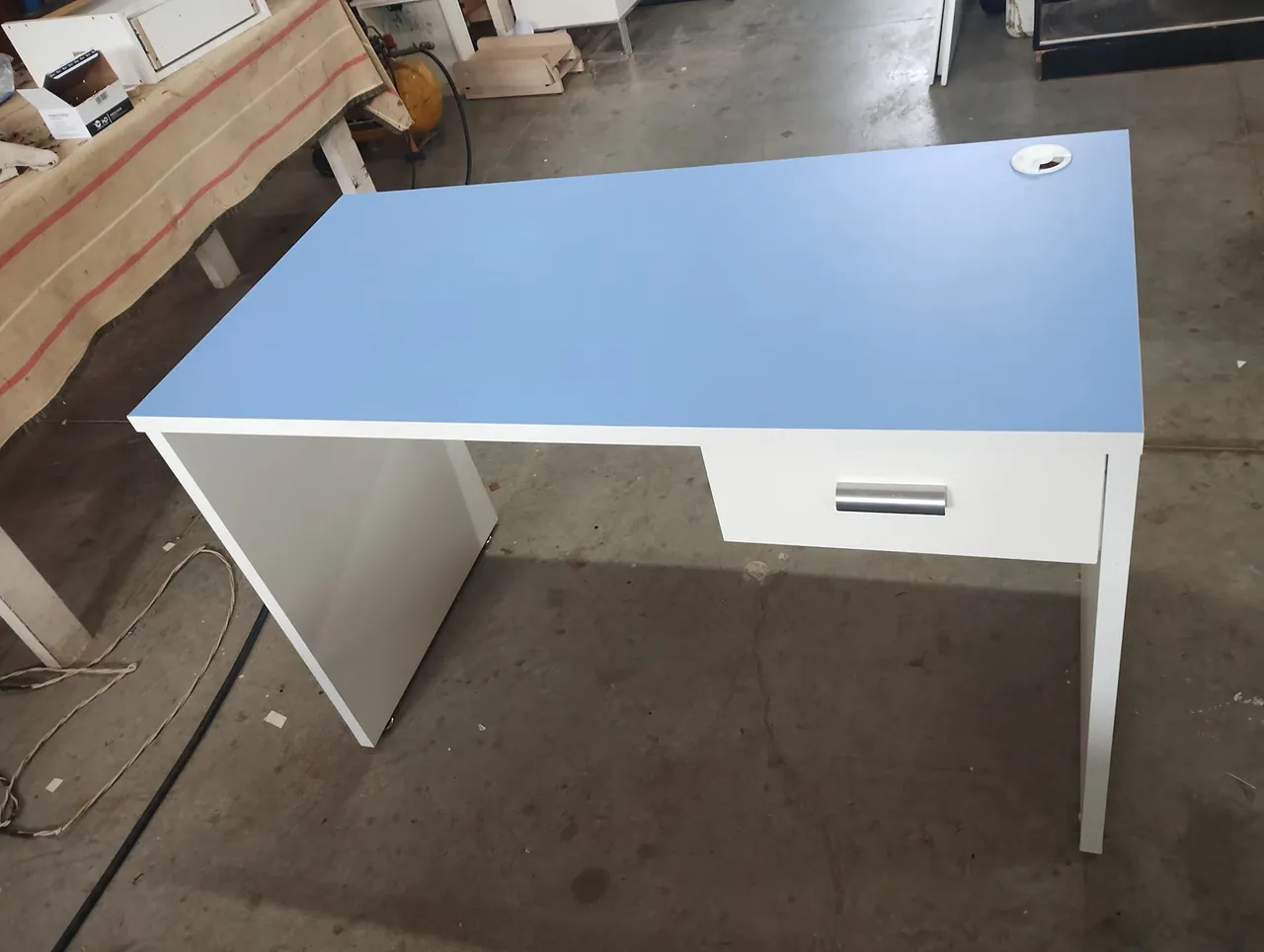 Mesa usada com tampo 25mm em fórmica azul , com fita de borda branca , pés brancos 25mm, medindo 1,19mt de largura 0,77cm de altura e 0,58 cm de profundidade, também tenho cadeiras a partir de 150,00