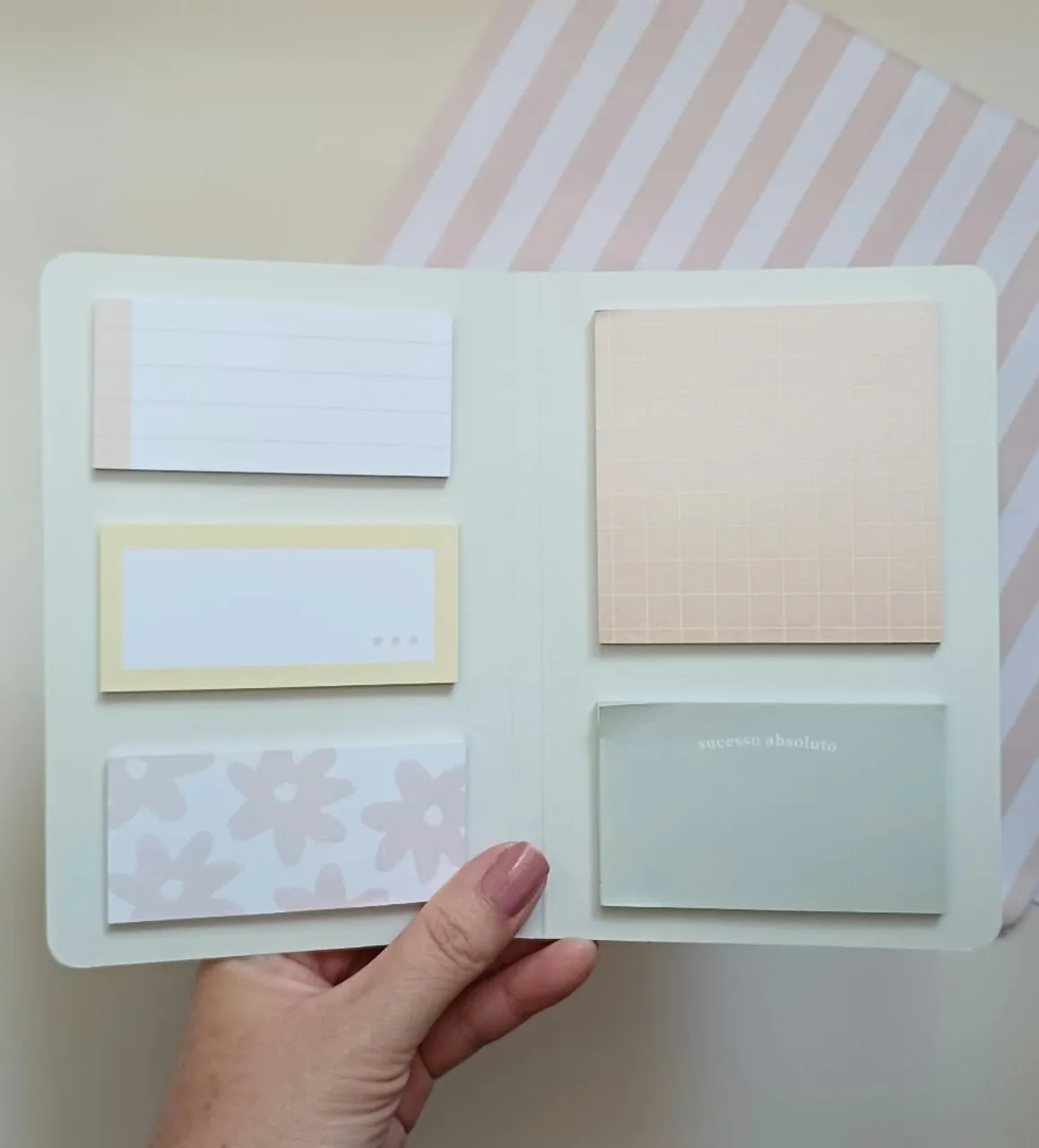 sticky notes com 5 modelos diferentes e autoadesivos, da papelaria meg & meg.