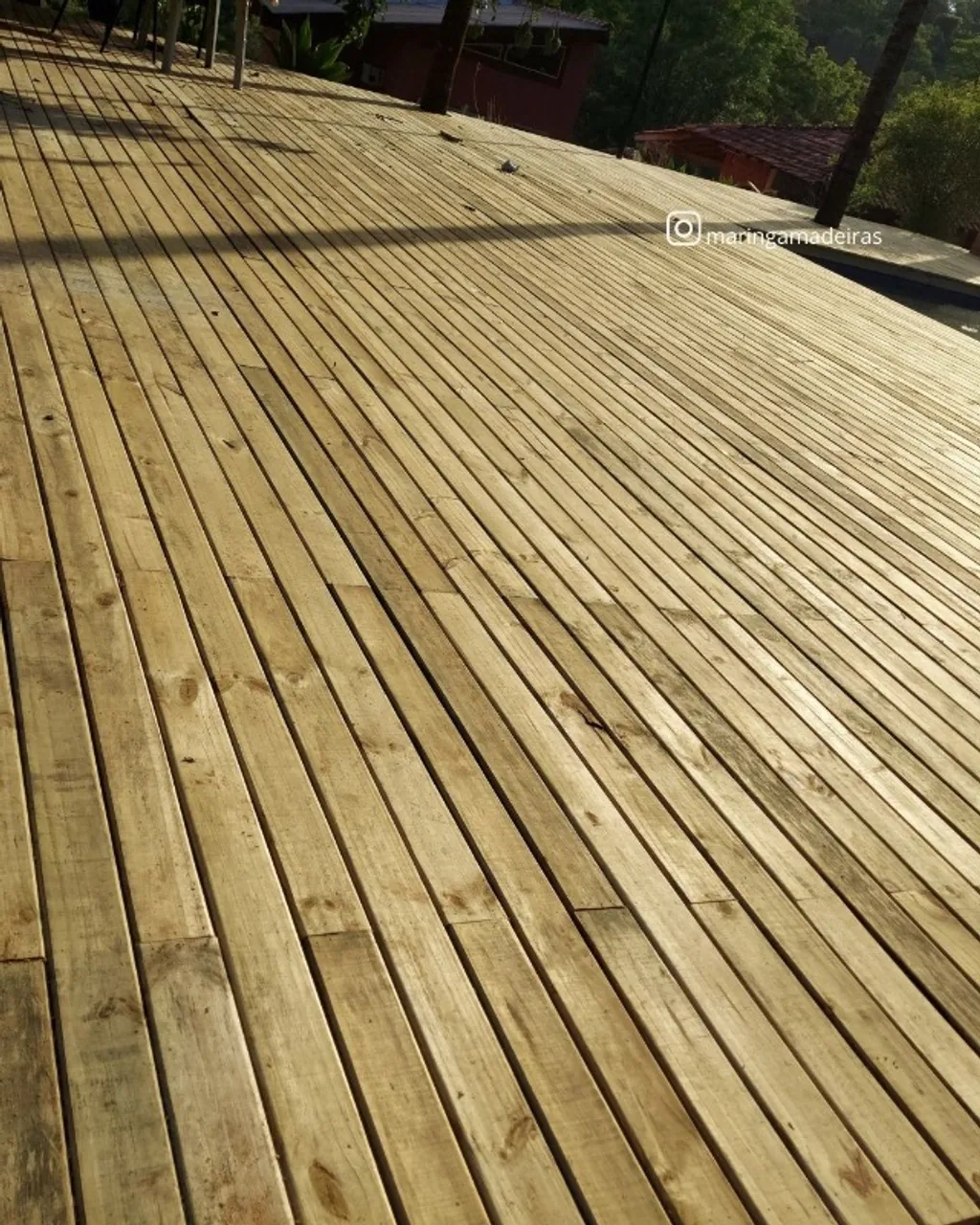 Deck de madeira autoclavada, perfeito para áreas externas, com alta durabilidade e resistência. Transforme seu espaço com elegância e sofisticação.