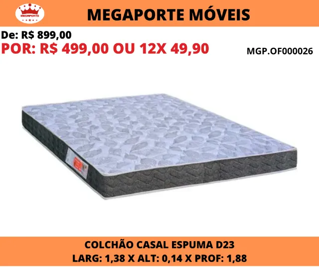 Desfrute de noites de sono revigorantes com o Colchão Casal Espuma D23! Conforto e suporte ideais para um descanso perfeito. Dimensões: 1,38m x 1,88m.