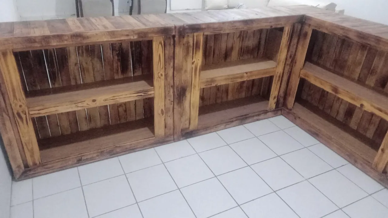 Balcão multiuso em madeira, ideal para otimizar espaços com elegância e praticidade. Perfeito para diversos ambientes, oferecendo funcionalidade e um toque rústico.