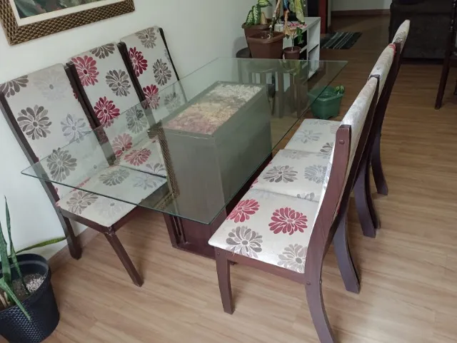 Linda mesa de jantar com design moderno e elegante. A mesa é de tampo de vidro, vai junto 6 cadeiras, a medida aproximada é de 1,60 de comprimento e 1 metro de largura. Dessas cadeiras, 3 precisam serem coladas. Possui um detalhe no meio decorativo, conforme consta na foto. Não faço entrega, Buscar no endereço localizado na Rua Largo Pioneiro José Ignacio da Silva. Interessados chamar no chat.