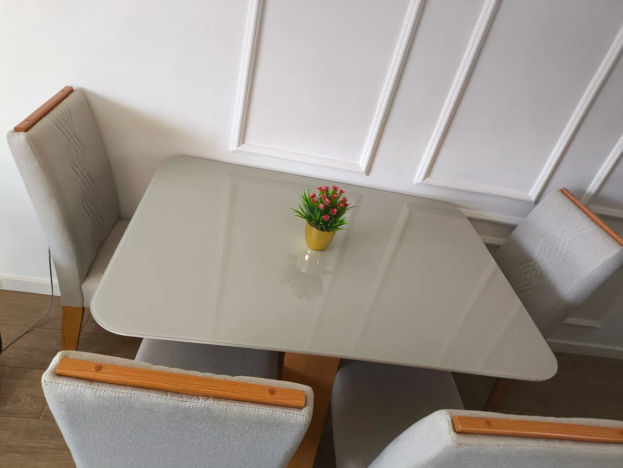 Linda mesa de jantar, com tampo de vidro, 4 lugares, apenas um aranhado na lateral, estou vendendo por motivo de mudança.