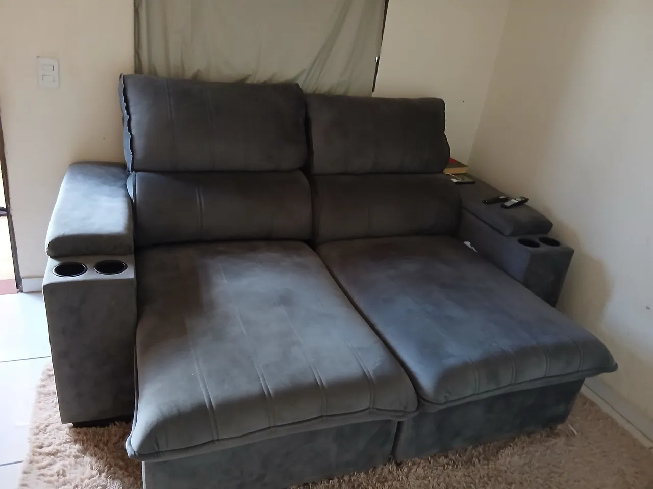 Sofá semi novo, nao esta manchado esta com as madeiras perfeitas, material, se nao me engano é suede