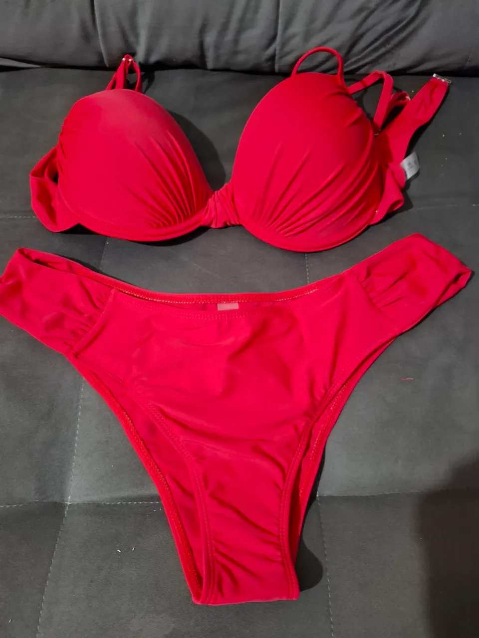 Desfrute do sol com estilo! Este biquíni de meia taça vermelho é perfeito para realçar sua beleza e garantir um visual incrível na praia ou piscina. Conforto e elegância em uma só peça!biquíni novos